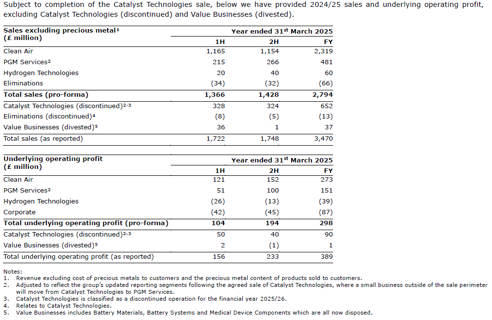 For the 2025/26 financial year, Catalyst Technologies will be reported as a discontinued operation in accordance with IFRS 5. Consequently, the headline financials to be published for the group (sales and underlying operating profit) will exclude Catalyst Technologies. To aid comparison of our results with prior periods, we have provided a breakdown of sales and underlying operating profit by business for the year ended 31st March 2025 in the appendix below.